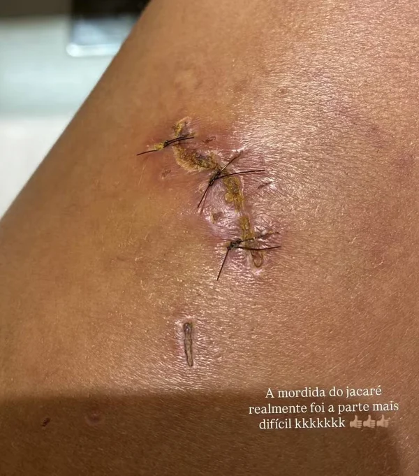 Imagem forte: Bella Campos exibe cicatriz de mordida de jacaré durante as gravações de "Pantanal"