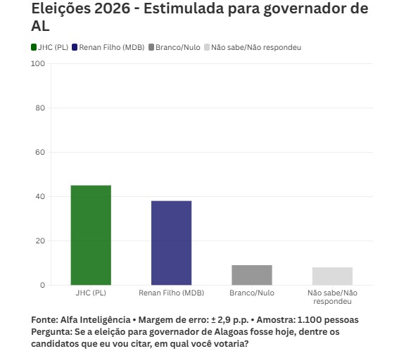 A pesquisa Alfa Inteligência mostra que o prefeito de Maceió, João Henrique Caldas (PL), o JHC, aparece com 45% das intenções de voto em um cenário para o governo de Alagoas em 2026. O ministro dos Transportes, Renan Filho (MDB), registra 38%.