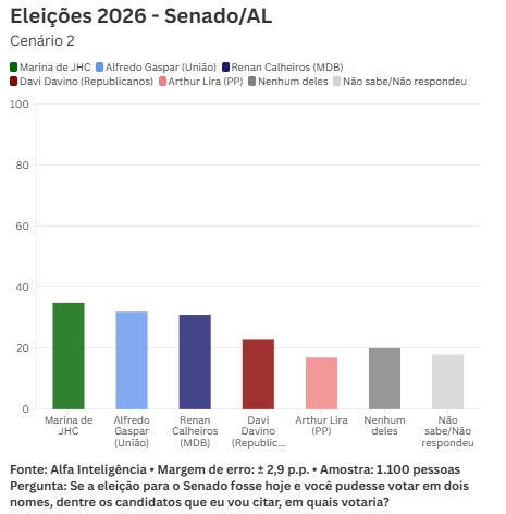 A Primeira-dama de Maceió, Marina Candia, lidera a corrida para o Senado em Alagoas no Cenário 2 da pesquisa Alfa Inteligência, divulgada nesta terça-feira. Ela aparece com 32% das intenções de voto, seguida por Alfredo Gaspar (União), que marca 31%, e pelo senador Renan Calheiros (MDB), com 30%.