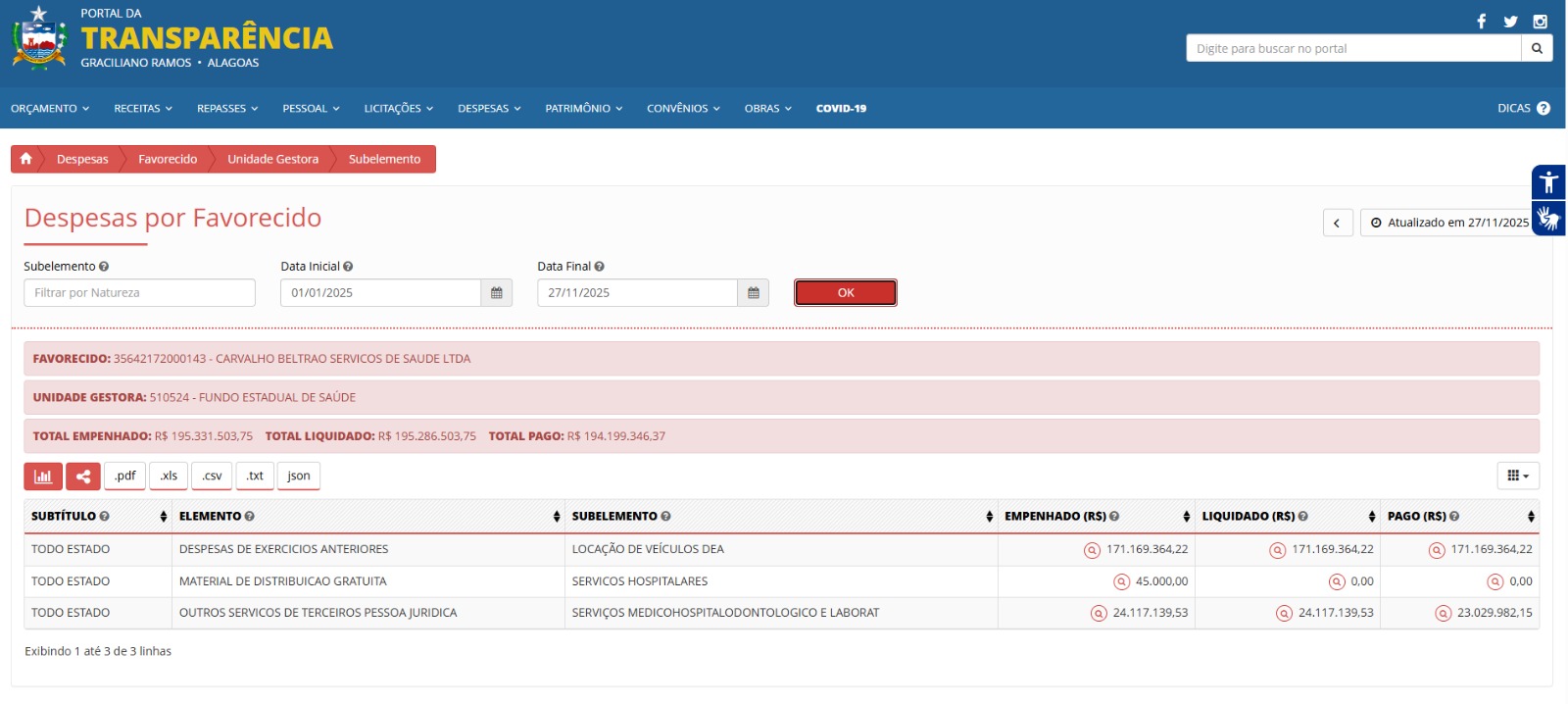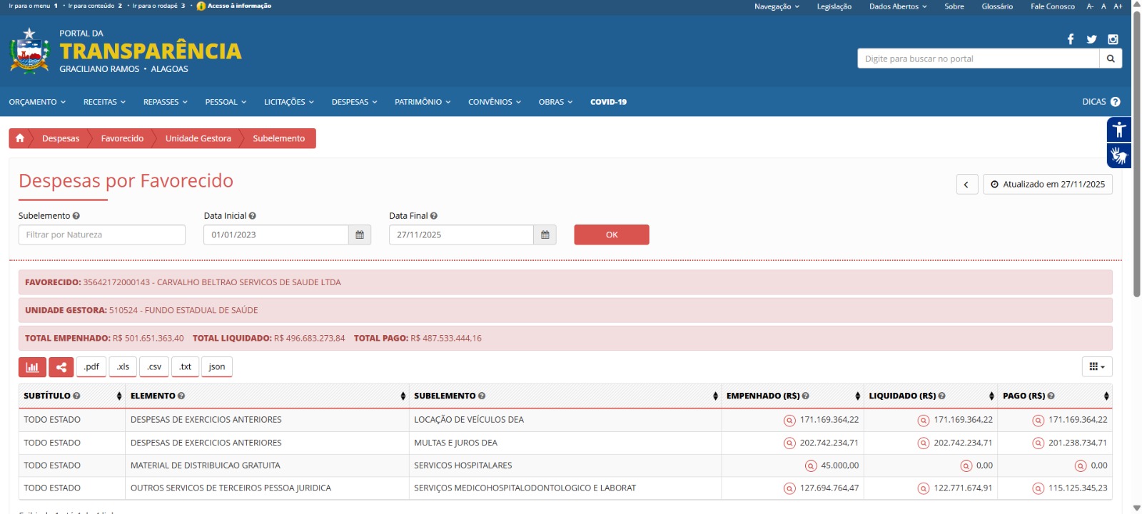 O Hospital Carvalho Beltrão, localizado em Coruripe e atualmente sob investigação do Ministério Público de Alagoas por supostas irregularidades no agendamento de cirurgias do SUS, recebeu R$ 194.199.346,37 do Fundo Estadual de Saúde apenas em 2025. Os dados do Portal da Transparência mostram que o total empenhado para a unidade neste período foi de R$ 195.286.503,75.