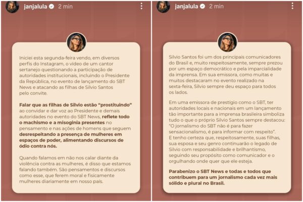 A manifestação de Janja foi feita por meio de publicações em seu perfil no Instagram. Ela afirmou que as falas do cantor, ao se referir às dirigentes da emissora, reproduzem discurso de desrespeito às mulheres que ocupam espaços de decisão. A reação ocorreu após Zezé usar a expressão “se prostituindo” ao comentar a atuação das herdeiras de Silvio Santos à frente do SBT.