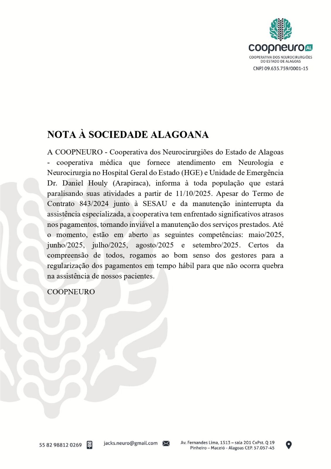 A COOPNEURO, cooperativa responsável pelos serviços de Neurologia e Neurocirurgia no Hospital Geral do Estado (HGE) e na Unidade de Emergência Dr. Daniel Houly, em Arapiraca, anunciou paralisação total de suas atividades a partir deste sábado (11). O motivo é a inadimplência do Governo do Estado de Alagoas, que não honrou os pagamentos do contrato vigente, tornando insustentável a manutenção dos atendimentos à população.